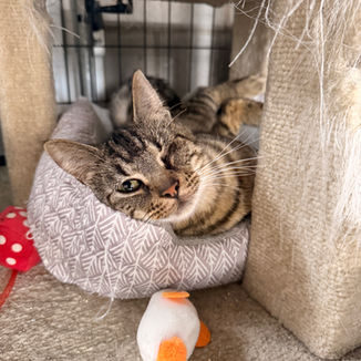 "Declan" is an approximately 5 year old, male dsh. When he isn't enjoying a nap in his cat tree, you can find him front and center ready for attention!
