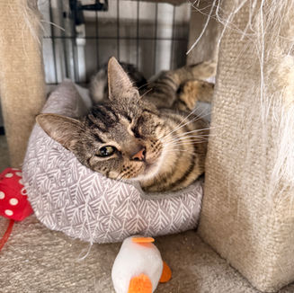 "Declan" is an approximately 5 year old, male dsh. When he isn't enjoying a nap in his cat tree, you can find him front and center ready for attention!